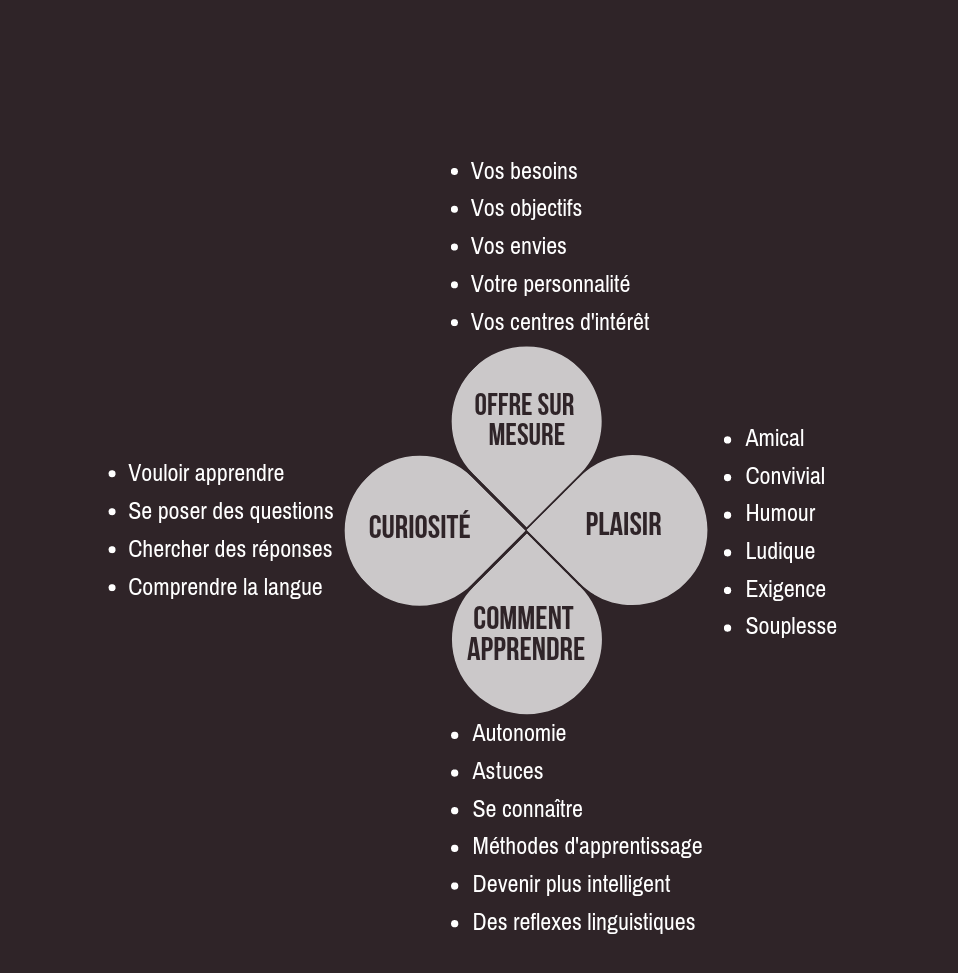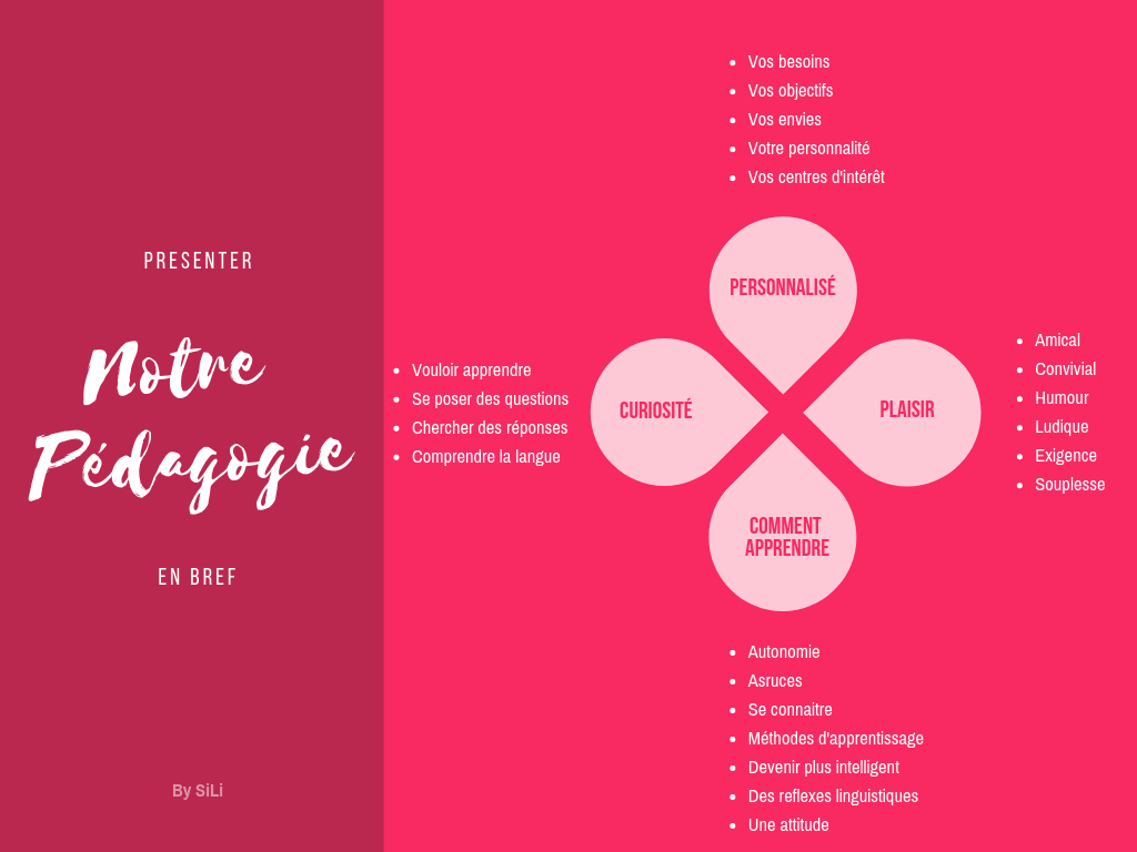 Notre pédagogie est simple. Nous avons pour ambition de vous faire aimer apprendre ou pratiquer une langue.